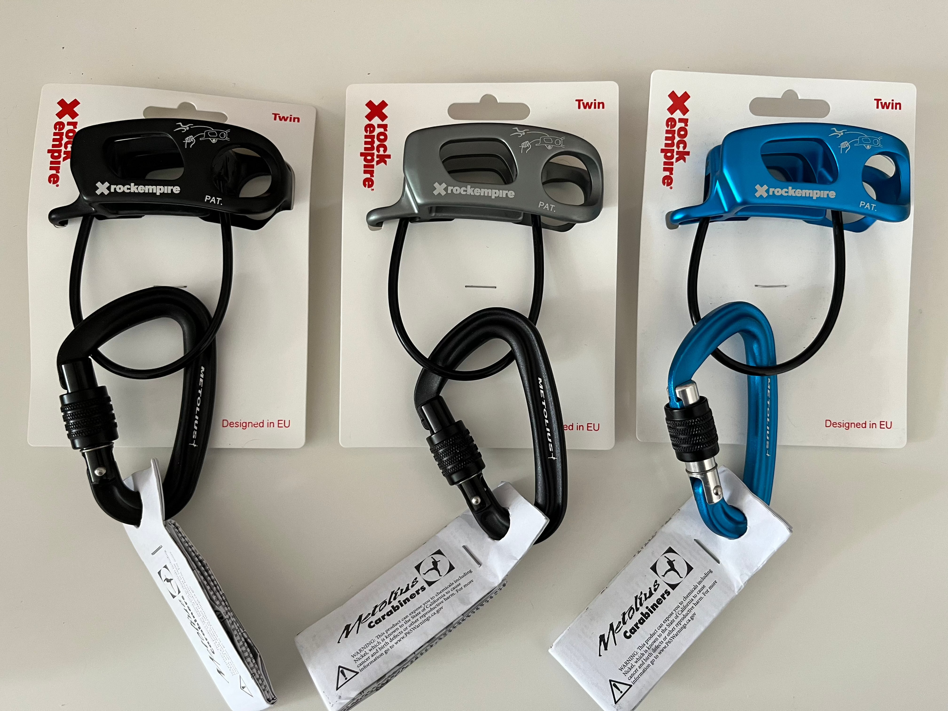 The Rock Empire Twin is a patented rappelling and belay device with an innovative, top-rope belay system. It allows an ideal attachment to different types of belay points (rings, bolt hangers) when belaying the second climber. It can be attached to the belay point in two positions. It can be rotated by 90° so that it is always correctly attached to both classic rings and hangers. The belay device is thus always oriented correctly in both cases, and the rope does not rub against the rock. This makes handling and belaying in the top-rope position more comfortable and safer.