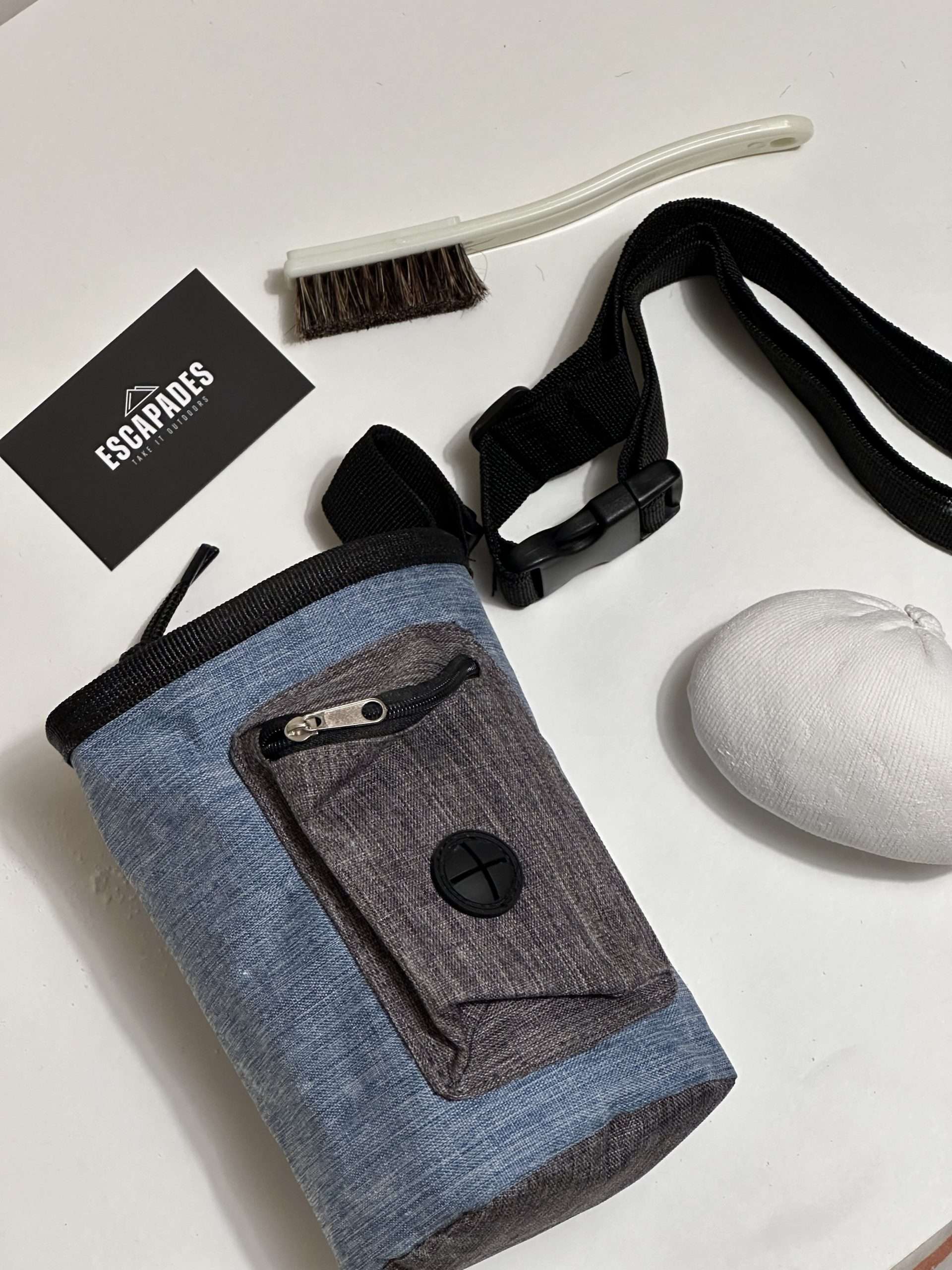 Escapades very own boulder bundle, the perfect gift and starter kit with everything you need to get you on the wall! A chalk bag in earthy blue, pink or brown with two pockets, drawstring close and a handy waist belt and harness clip. A chalk ball (perfect for beginners who want to keep the chalk tidy) and a boar hair brush to clean off the excess chalk from holds to give you maximum grip!
