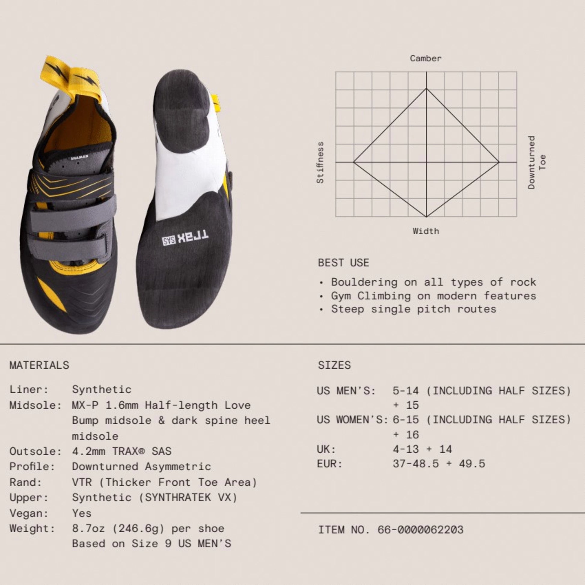 A modern cambered shoe designed for the climber who challenges themselves with different types of climbing. Equally home on overhanging gymnastic and steep routes that require precise footwork. The vegan synthetic upper is built on an aggressively profiled last will ensure your foot is always in a power position and that the shoe will not stretch too much over time. Excelling on every angle and rock type, if there was one shoe to rule them all, it would be Shaman. The tensioned heel rand will provide enough power and support to bear down on small edges, while yielding enough to climb those off vertical angles. The love bump plastic midsole places your toes into a crimped power position, while the knuckle box provides room, so you do not smash your toes against the top of the toe rand, these two features work in parallel to eliminate dead space under your toes and creates a comfortable and powerful sensation out of the box.