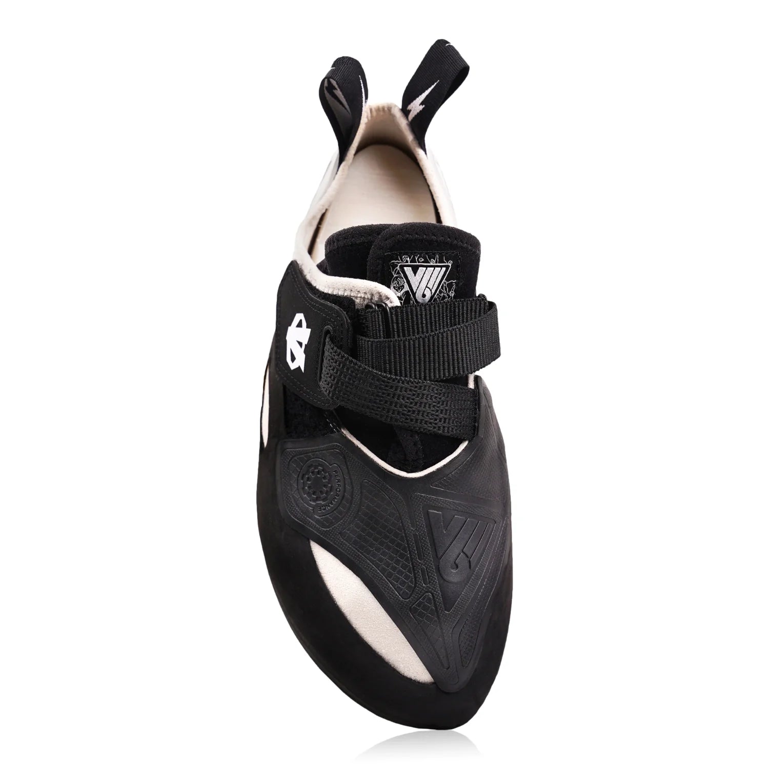 The V6 is made for climbers who want to become experts quickly on any terrain. Its adjustable single strap closure ensures easy adjustment and paired with an easy entry split tongue allows climbers to transition between climbs comfortably and quickly. The downturned toe provides precision on steep small holds. It features a large toe patch to provide secure and stable toe hooking. The tensioned heel rand creates a locked in feel for maximum security and precision while heel hooking. Smearing is easy with the even flex of the full-length outsole. The V6 uses Evolv’s proprietary TRAX SAS® rubber compound to ensure superior stickiness on diverse terrain. All materials used in the V6 are 100% vegan. The V6 also comes in a Low Volume to ensure the best fit for a climber’s foot shape and performance goals. The V6 offers a balanced feature set to smear, edge, toe hook and heel hook with immediate comfort out of the box to enable a climber's quick progression to V6 and beyond.