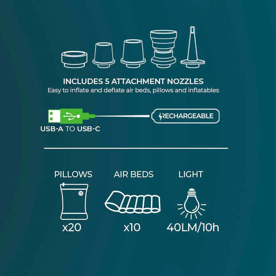 Pack the Highlander lightweight, compact and easy to use Wee Banshee mini air pump with you for inflating air beds, pillows, etc. Not only is it light and portable but also USB Rechargeable and has a bright, built in camping lantern.